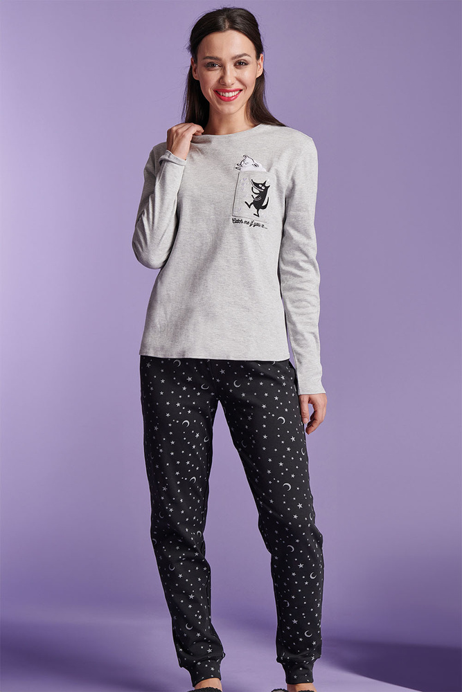 Shearly Pijama de mujer Sorbetto gris - 100% algodón, aplicación 3D, pantalón con cordón