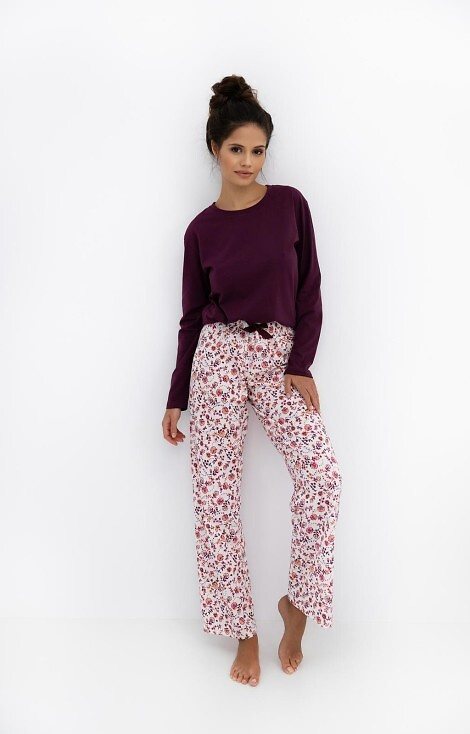 • Pijama de dos piezas Heidi de Sensis. Camiseta de manga larga burdeos, pantalón largo con estampado floral, cintura elástica y lazo de raso. Composición: 100% algodón.