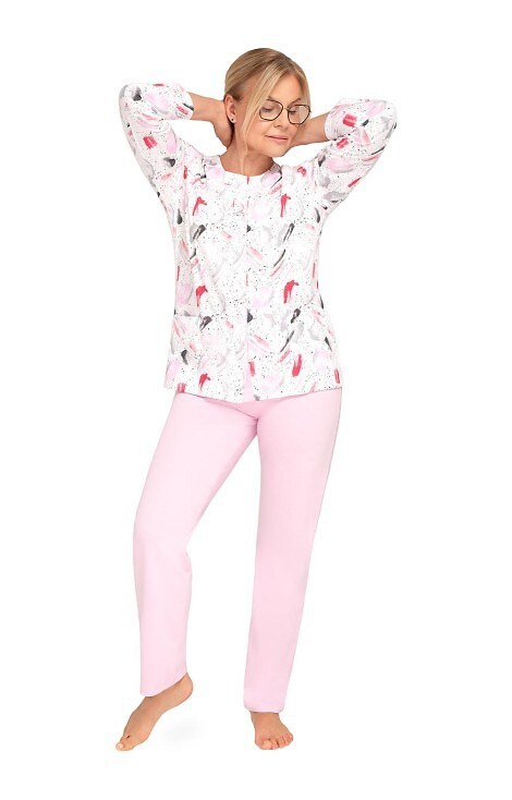 • Pijama de mujer de algodón Martel Maria III 202. Camiseta de manga larga desabrochada con estampado, pantalón liso con cintura elástica.