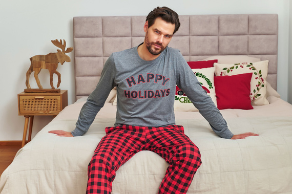 - Pijama de hombre cómodo y elegante. Sudadera gris con estampado "Happy Holidays" y pantalón de cuadros rojos y negros. Algodón natural 100%.