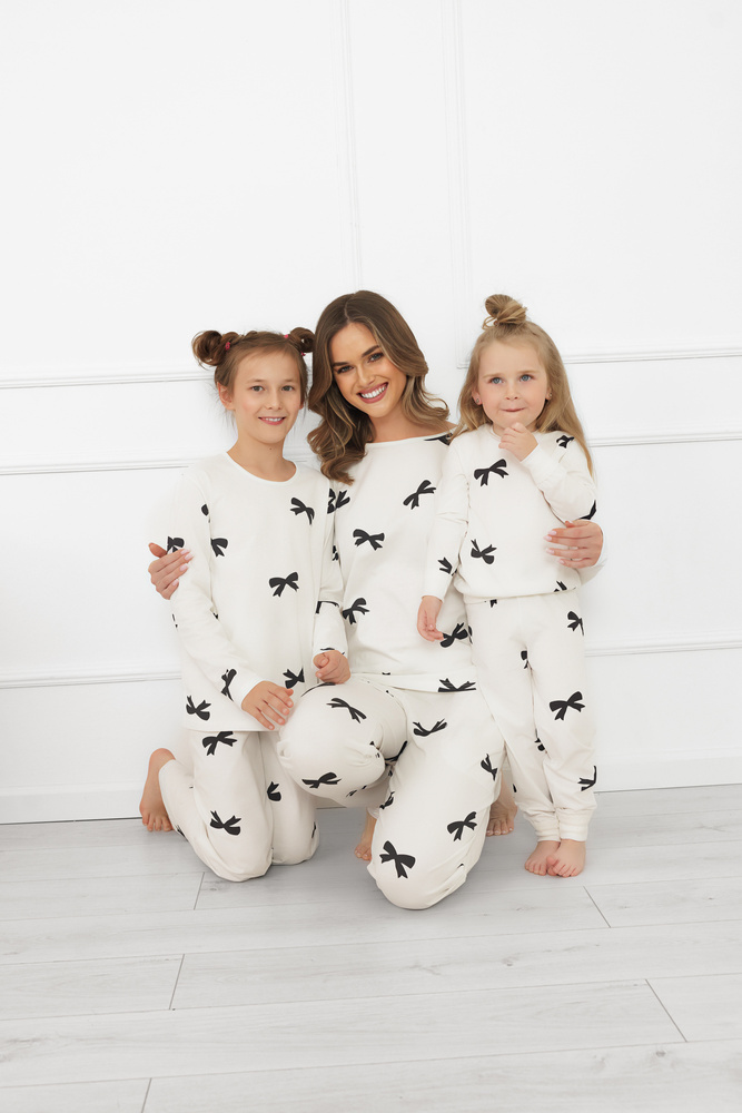 El modelo de color crudo está decorado con un sutil estampado de lazos negros en contraste, que aportan un toque único al conjunto. Corte más holgado para mayor libertad de movimientos y ribetes deportivos para un look moderno.