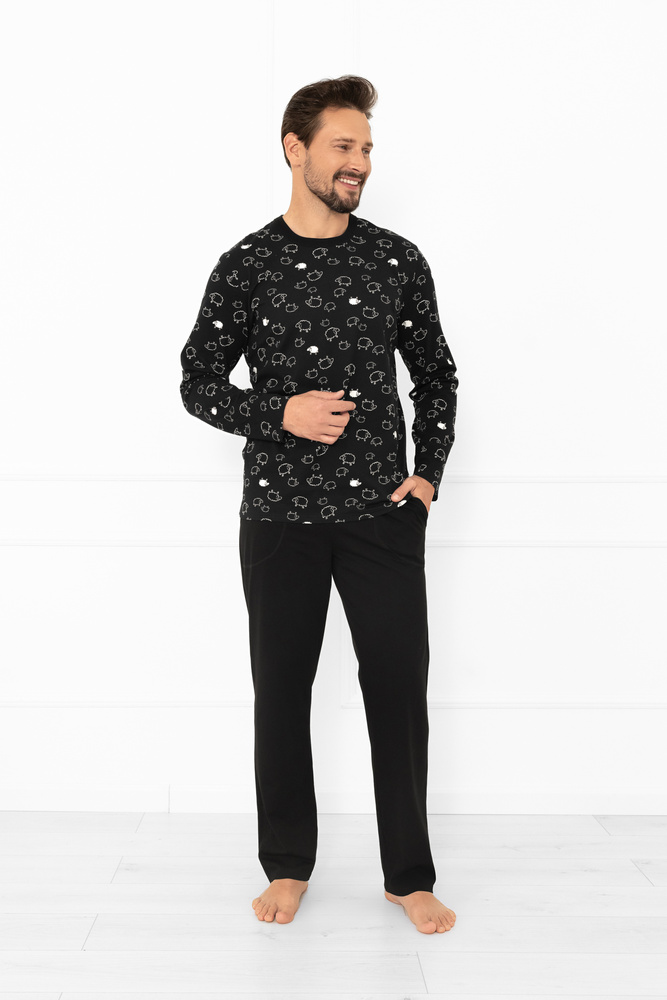 • Pijama de hombre Wito de punto MEGA SOFT (100% algodón). Blusa de manga larga y escote redondo en negro con motivo de oveja blanca. Pantalón de color liso con cintura elástica y bolsillos laterales.