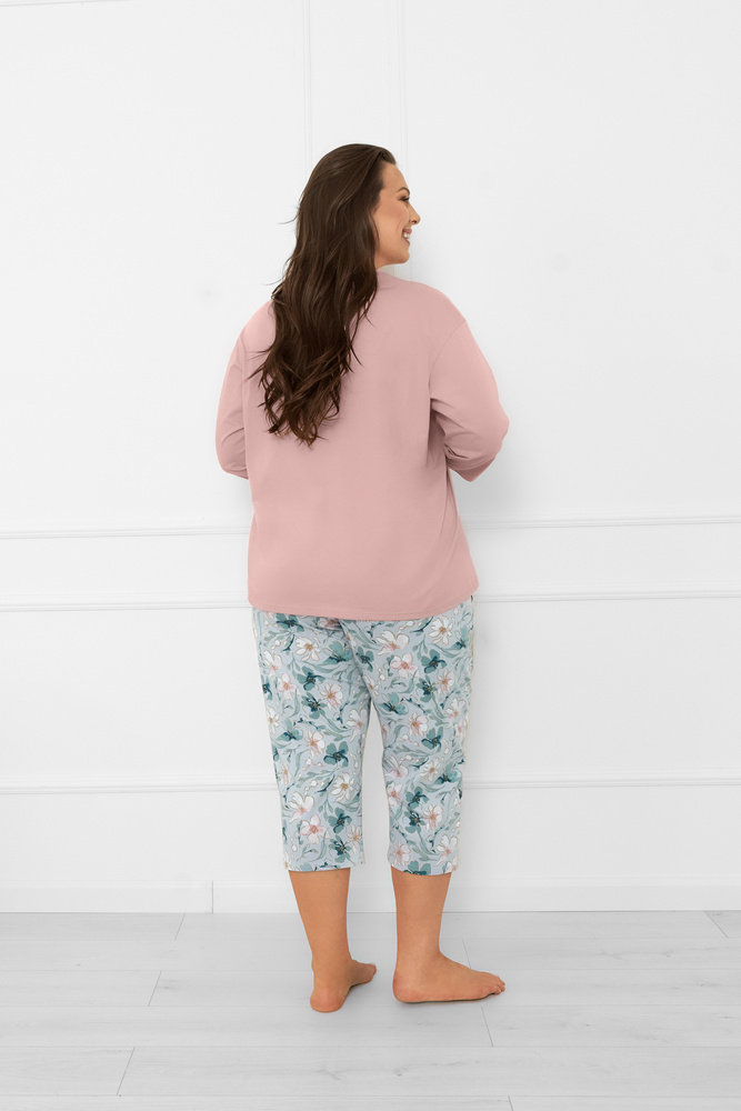 El pijama de mujer Perlis es una opción clásica y cómoda para las mujeres que aprecian los materiales naturales y la funcionalidad. Fabricado en algodón de alta calidad, proporciona comodidad y transpirabilidad durante todo el año. La camiseta de pijama tiene un corte recto y holgado, mangas 3/4 y un sutil estampado de flores a la altura del pecho. Los pantalones del mismo estilo están decorados con un delicado estampado floral, tienen cintura elástica y dos prácticos bolsillos. La longitud 3/4 hace que el conjunto sea adecuado tanto para los días más cálidos como para los más frescos.