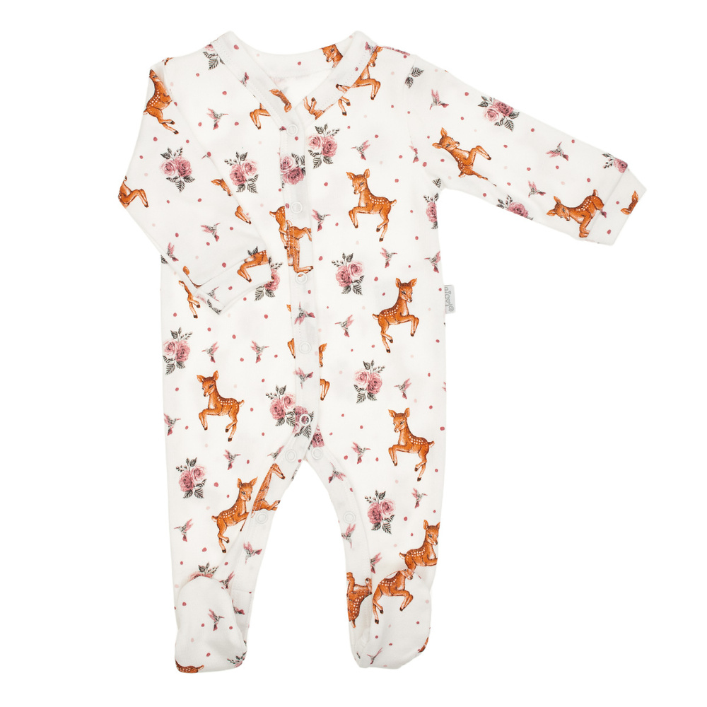 Decorado con un femenino estampado de corzos, pájaros y rosas, el modelo tiene un aspecto excepcionalmente delicado y sutil. El ajuste holgado garantiza la libertad de movimiento, mientras que el material natural garantiza una cómoda experiencia de sueño y juego. Esta práctica y elegante prenda para el día a día.