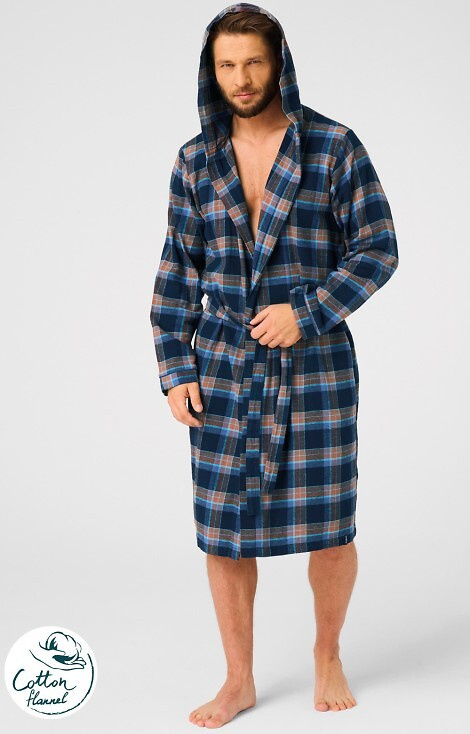 • Albornoz de punto suave Key MGL 431 para hombre. Estampado de cuadros, bolsillos, cintura, cuello chal.