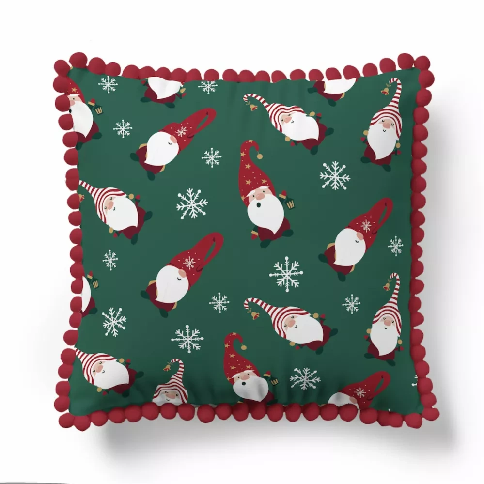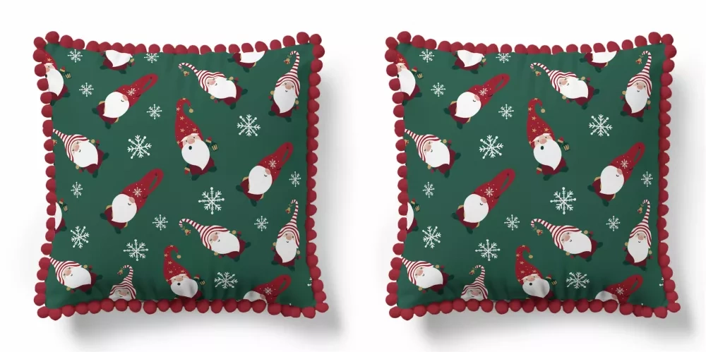 5383 Una Navidad funda de almohada decorativa Navidad Deco Detexpol gnomos y copos de nieve sobre fondo verde- cremallera