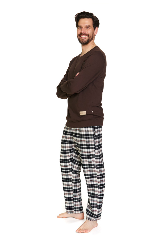 El pijama de hombre Doctor Nap 7334 es la elección perfecta para las noches de otoño e invierno. El top está confeccionado en suave punto de algodón para mayor comodidad y libertad de movimientos. Los pantalones están cosidos con franela de algodón 100% de alta calidad, lo que los hace cálidos y agradables al tacto. Un clásico estampado de cuadros en tonos marrones confiere al conjunto un aire atemporal. El corte recto, la cómoda cintura y los materiales naturales hacen que este pijama sea perfecto tanto para dormir como para relajarse en casa por la noche.
