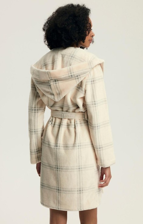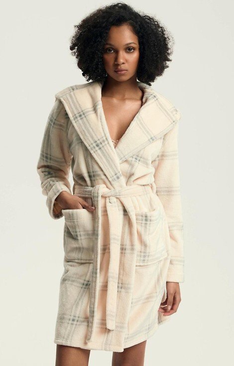 • Albornoz de señora en suave tejido de punto, con capucha y bolsillos. El estampado de cuadros le añade encanto.