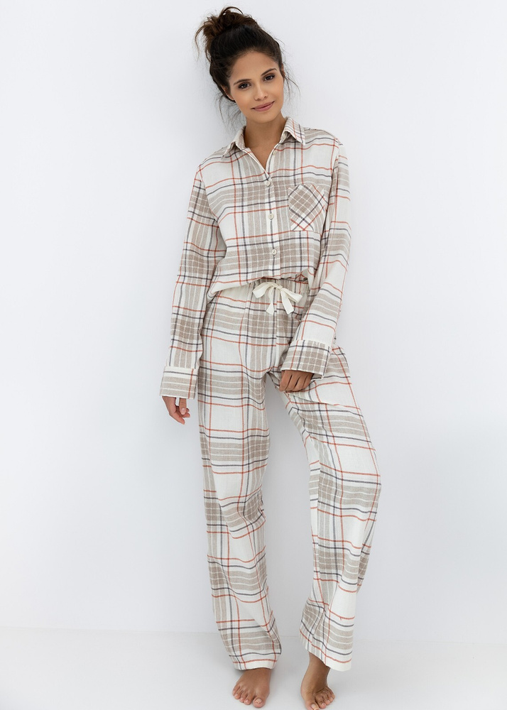 La parte superior del pijama es una camisa de cuello, abotonada, con un bolsillo en el pecho. Los pantalones largos con cintura elástica y anudados permiten ajustar la circunferencia, lo que garantiza un uso cómodo.