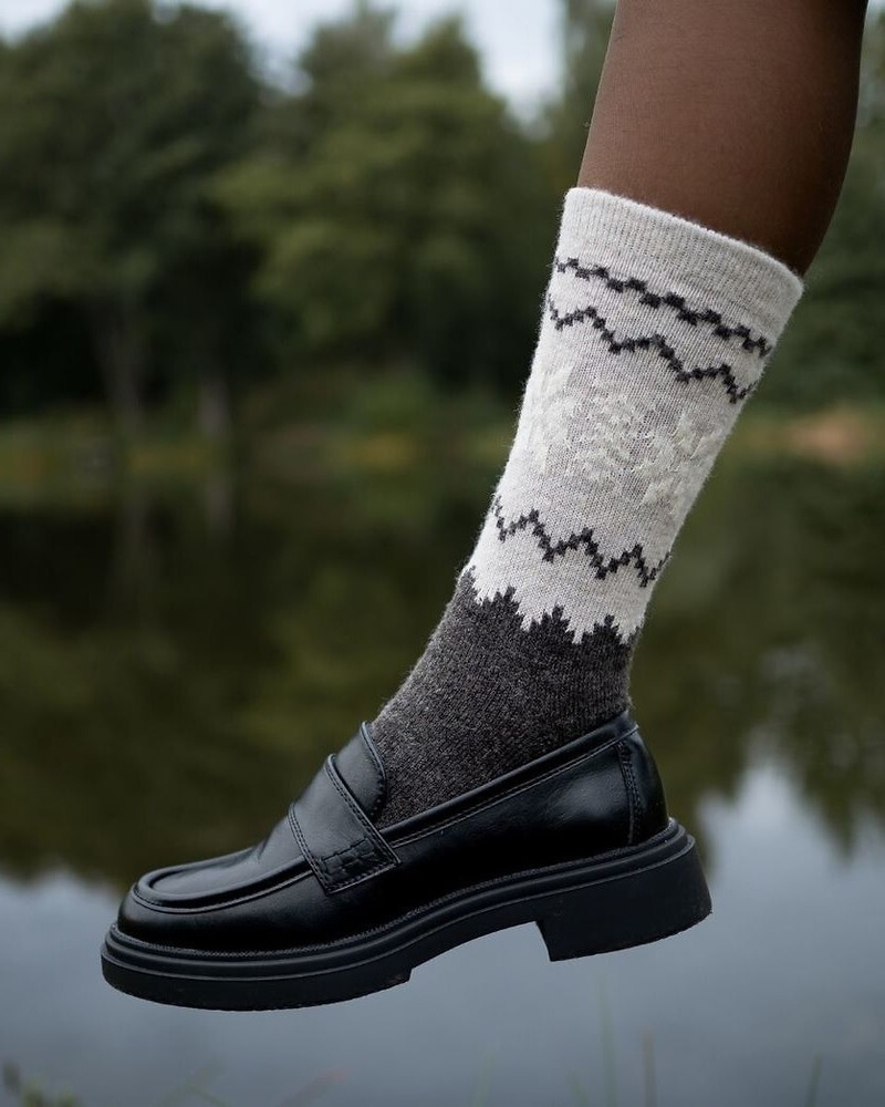 El modelo se distingue por un llamativo estampado invernal que le confiere un aire acogedor. Las costuras planas eliminan el riesgo de rozaduras y un cómodo ribete mantiene el calcetín en su sitio sin presionar. Perfecta para llevar con zapatos altos - ideal para caminar, trabajar o llevar en casa.