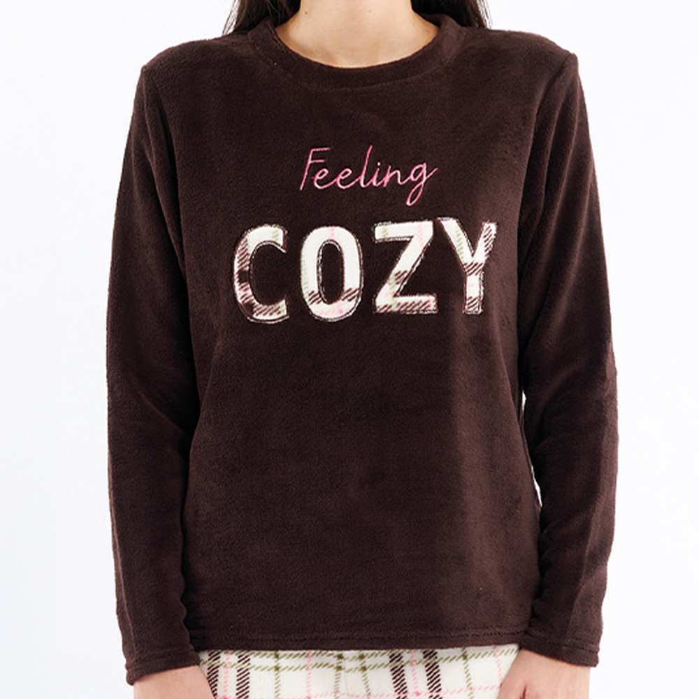 Una sudadera adornada con el bordado "Feeling Cozy" subraya el carácter acogedor del conjunto, mientras que los pantalones de cuadros en colores clásicos le dan un aspecto invernal a la moda.