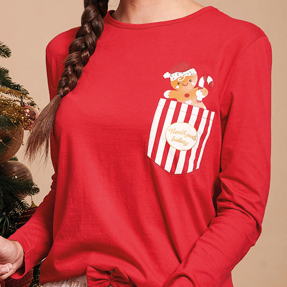 Bluzka z długim rękawem ma uroczą kieszonkę na piersi i nadruk piernika, który wprowadza słodki, świąteczny nastrój.