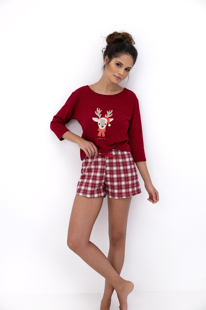 - Cómodo pijama Elia Sensis de algodón 100% suave y transpirable. El conjunto se compone de una camiseta de manga 3/4 con un simpático estampado navideño y un pantalón corto a cuadros con un lazo de raso.
