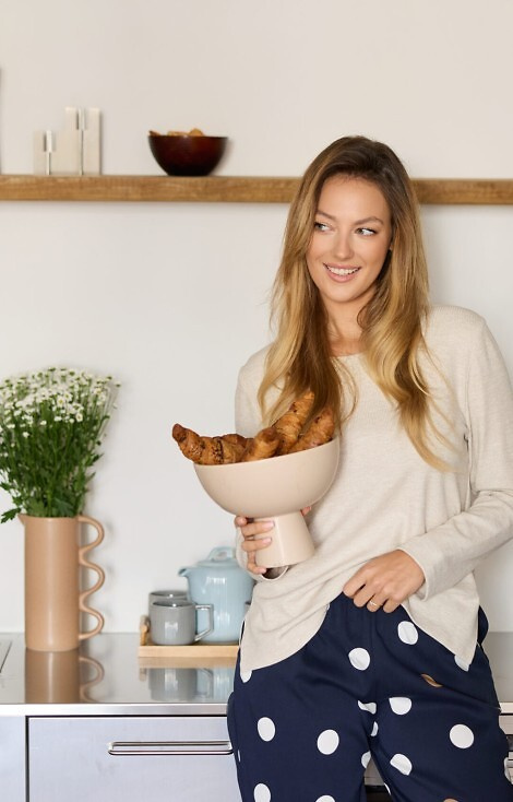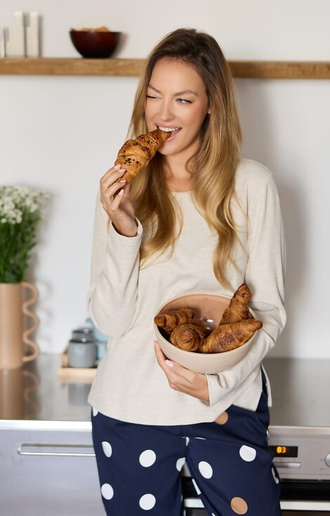 El conjunto incluye un pantalón largo de viscosa, decorado con un encantador estampado de guisantes.