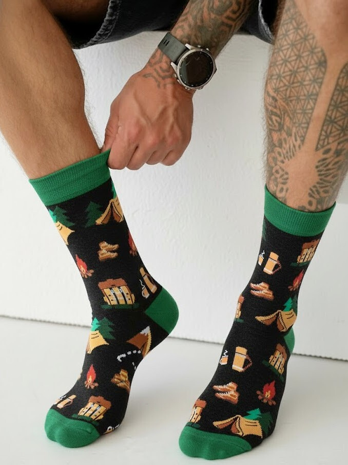 - Calcetines de trekking para hombre con estampado de colores. Se ajustan perfectamente al pie y tienen un cómodo ribete elástico. El algodón de alta calidad proporciona comodidad todos los días.