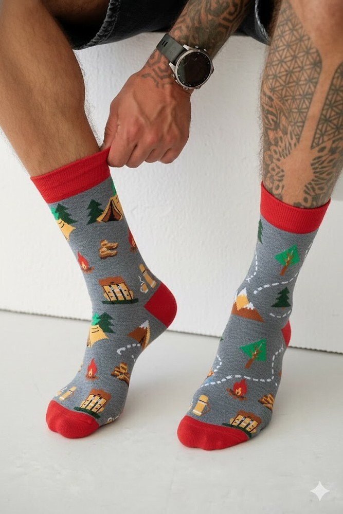 - Calcetines de trekking para hombre con estampado de colores. Se ajustan perfectamente al pie y tienen un cómodo ribete elástico. El algodón de alta calidad proporciona comodidad todos los días.