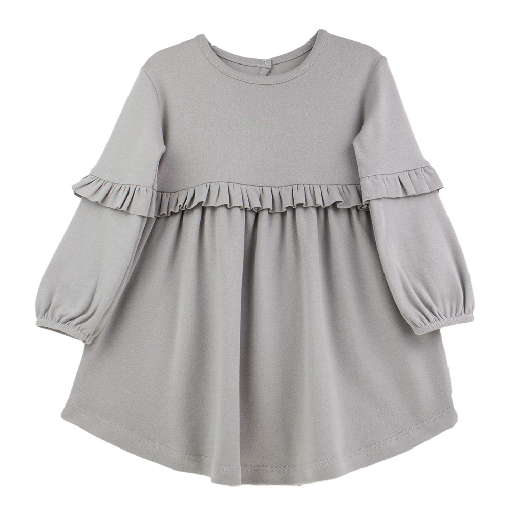- Vestido Nicol gris de manga larga para niña, 100% algodón certificado. Decorada con volantes y provista de un práctico cierre de lágrima.