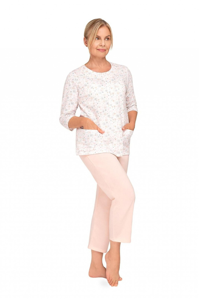 La camisa de pijama está decorada con un sutil motivo floral, que aporta ligereza y un toque femenino. Manga 3/4 hace que el modelo sea ideal para su uso durante todo el año, tanto en las noches más cálidas como en las más frías. Escote semicircular y cierre con botón hacen que sea más cómodo de llevar y más fácil de poner.