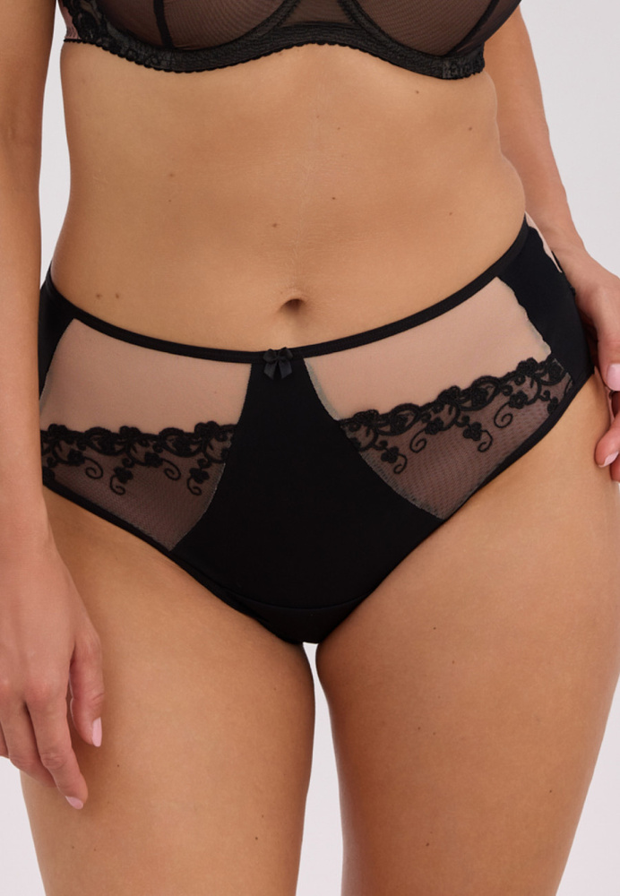 Przód fig wykonany został z miękkiej, czarnej dzianiny, która delikatnie otula ciało, nie powodując ucisku ani podrażnień. Materiał jest elastyczny i przyjemny w dotyku, dzięki czemu figi zachowują komfort nawet przy wielogodzinnym noszeniu. Tył majtek stanowi wyjątkowe połączenie półtransparentnej siateczki w odcieniu mokka z dekoracyjną koronką, która dodaje całości lekkości, subtelnej zmysłowości i elegancji.