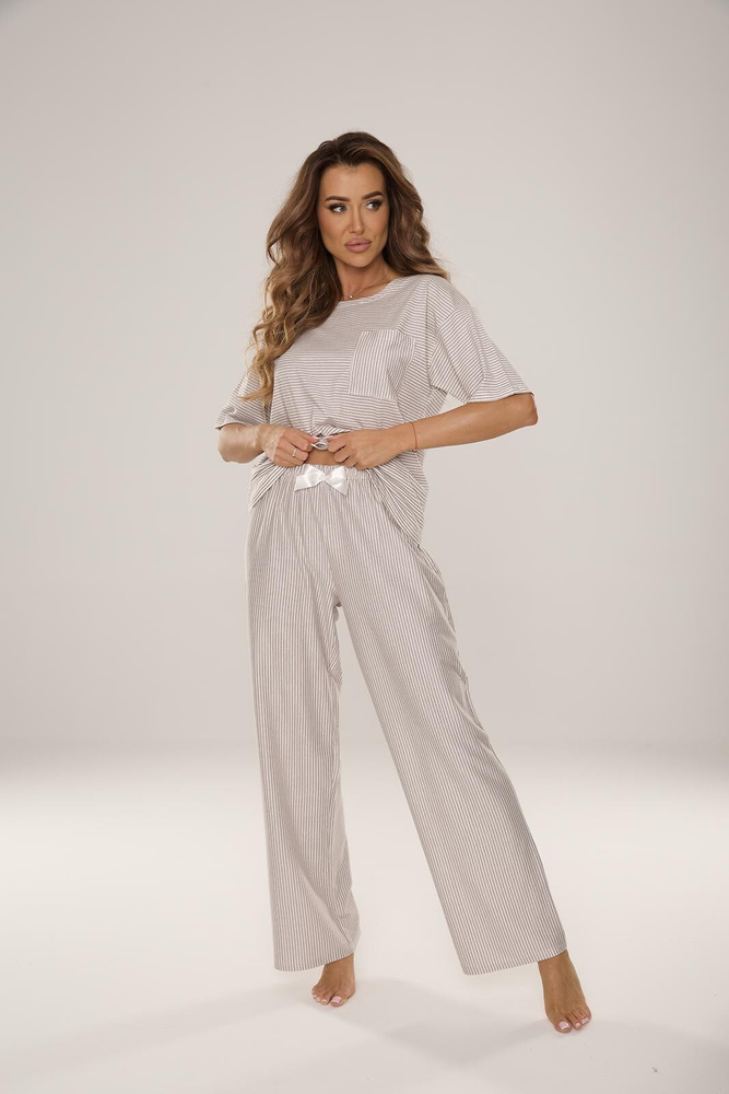 El conjunto incluye pantalones largos perfectos para las noches y mañanas más frescas. Un lazo decorativo en la cintura acentúa el carácter femenino del pijama, sin que ello afecte a la comodidad de quien lo lleva. El algodón natural permite que la piel respire y evita el sobrecalentamiento, lo que mejora notablemente la calidad del sueño.