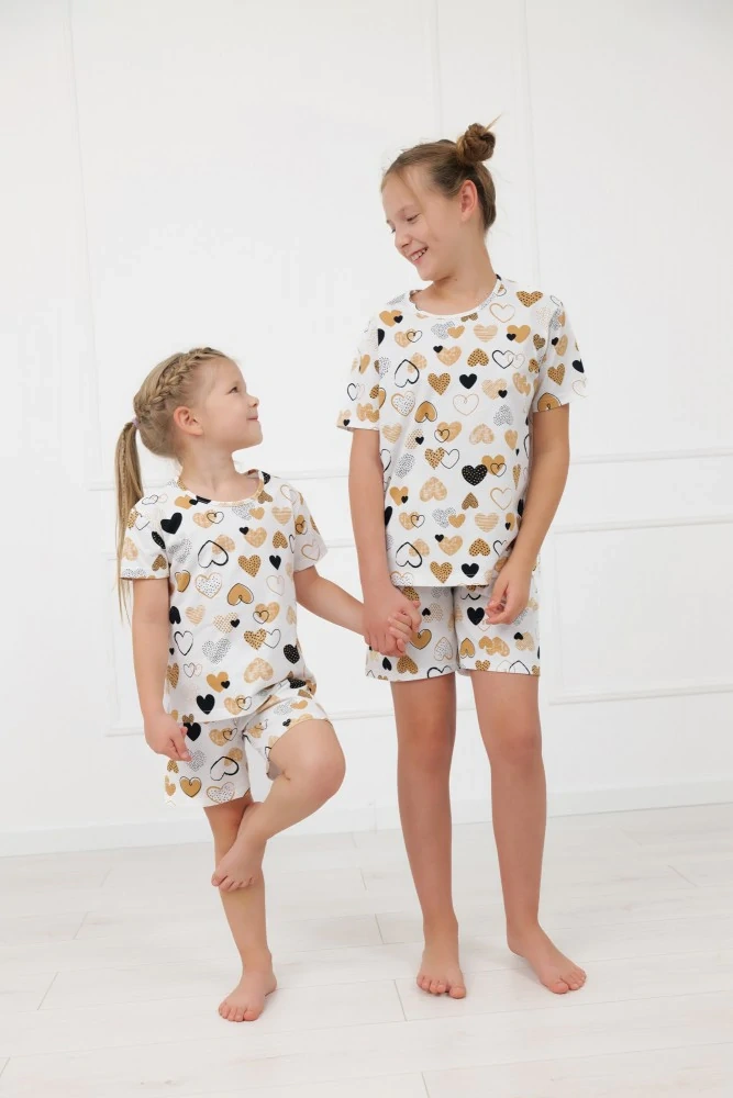 La parte superior del conjunto es una camiseta clásica con escote redondo. Corte sencillo y holgado para un movimiento sin restricciones y comodidad durante toda la noche. La camiseta sienta bien a la figura de un niño y también funciona bien como parte de un conjunto casero. El pantalón de pijama es un short corto con una suave cintura elástica colocada en un túnel, que no oprime y se adapta a la figura del niño, garantizando la comodidad incluso durante los movimientos intensos.