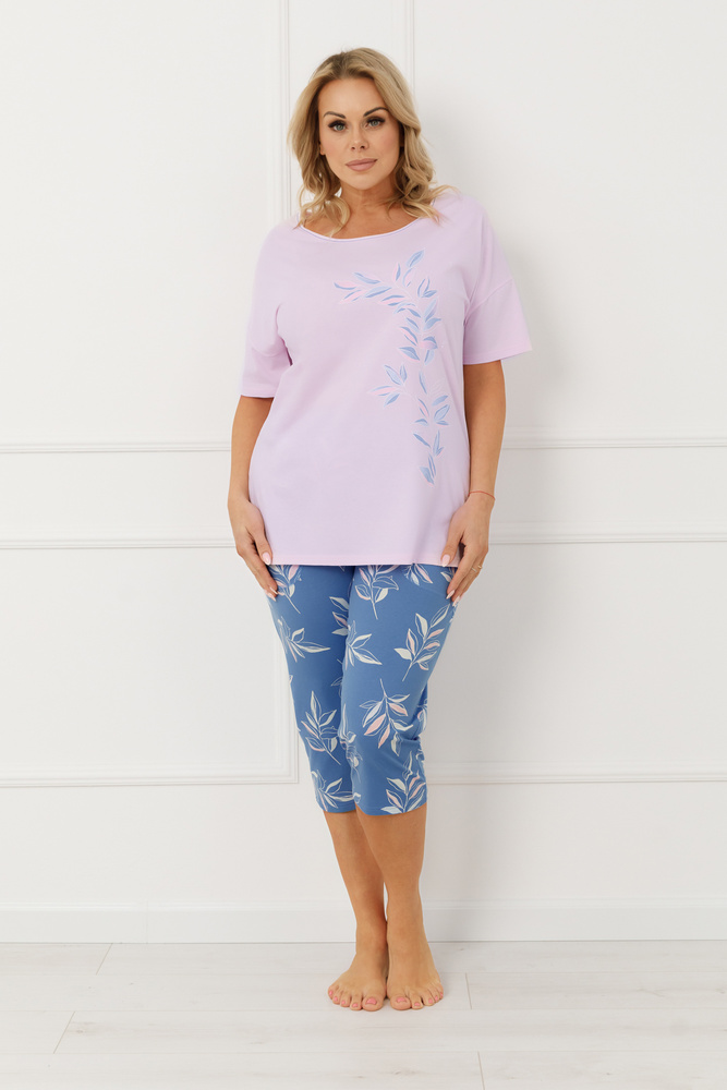 La parte superior del conjunto es una blusa de manga corta con un clásico escote redondo, rematada con un delicado dobladillo en contraste. Este detalle confiere una ligereza deportiva al conjunto, al tiempo que mantiene un carácter femenino. Un sutil estampado floral en un lado de la blusa confiere al pijama un aspecto estético y atemporal. El pantalón de largo 3/4 está decorado con un motivo floral y presenta dos prácticos bolsillos laterales, lo que aumenta la funcionalidad del modelo, que también resultará ideal como cómodo atuendo para estar en casa.