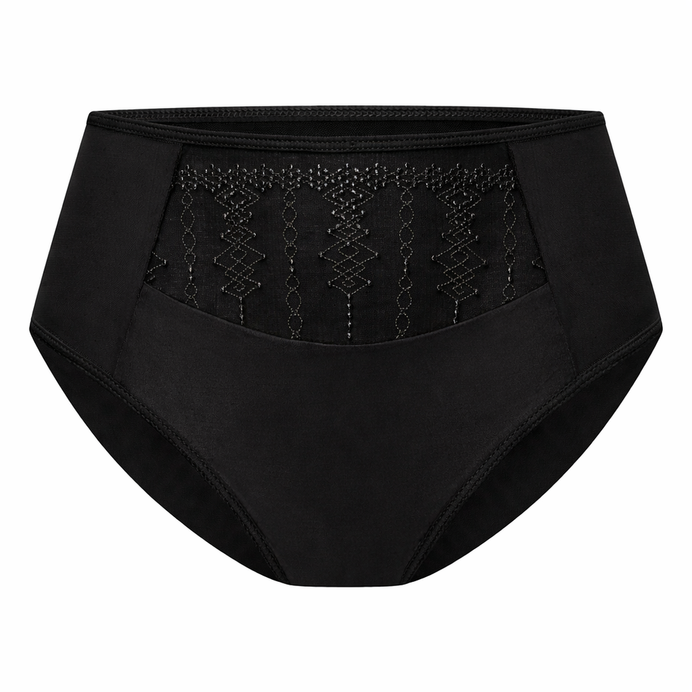 La parte frontal está confeccionada en un tejido liso y elástico que se adapta suavemente a la silueta sin marcar bajo prendas ajustadas. La zona superior incorpora un bordado delicado, coordinado con el diseño del sujetador de la misma colección, aportando un toque femenino y elegante sin excesos. Los laterales y la parte trasera ofrecen ligereza y libertad de movimiento, lo que hace que la prenda resulte cómoda durante todo el día.