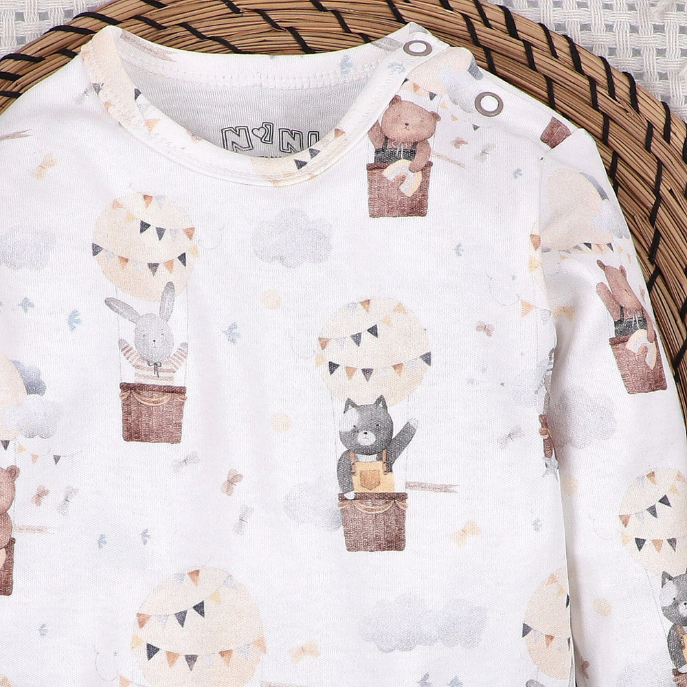 La tecnología de impresión digital garantiza diseños precisos y colores resistentes incluso tras lavados frecuentes. El corte está pensado para adaptarse suavemente al cuerpo del bebé sin limitar sus movimientos. Puede utilizarse como prenda única en días cálidos o como primera capa bajo pijamas, peleles o conjuntos.
