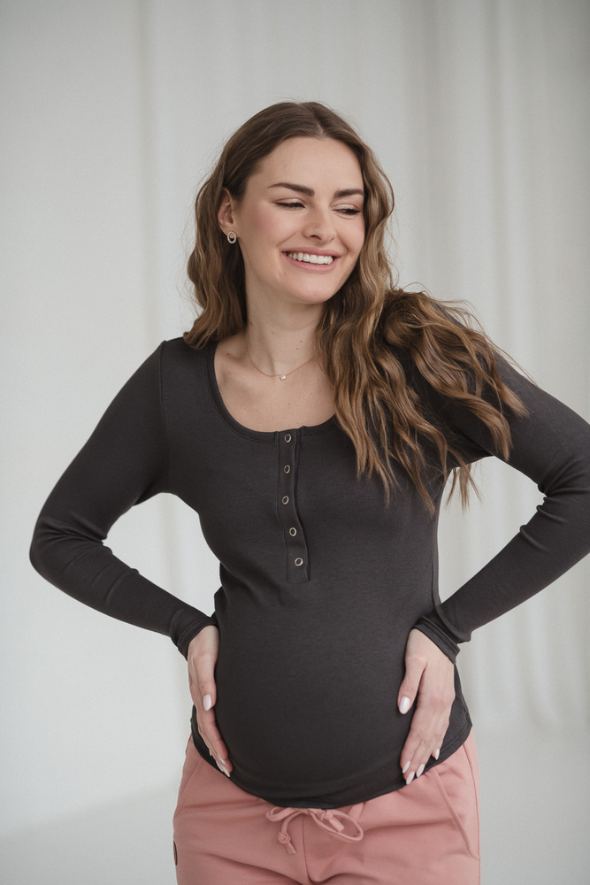 El corte entallado realza la silueta, mientras que los botones a presión plateados en el escote permiten una lactancia rápida y discreta en cualquier situación, tanto en casa como fuera. Además, aportan un detalle decorativo sutil. Puedes combinarla con jeans premamá, leggings o pantalones más elegantes, logrando looks casuales o más formales según la ocasión.