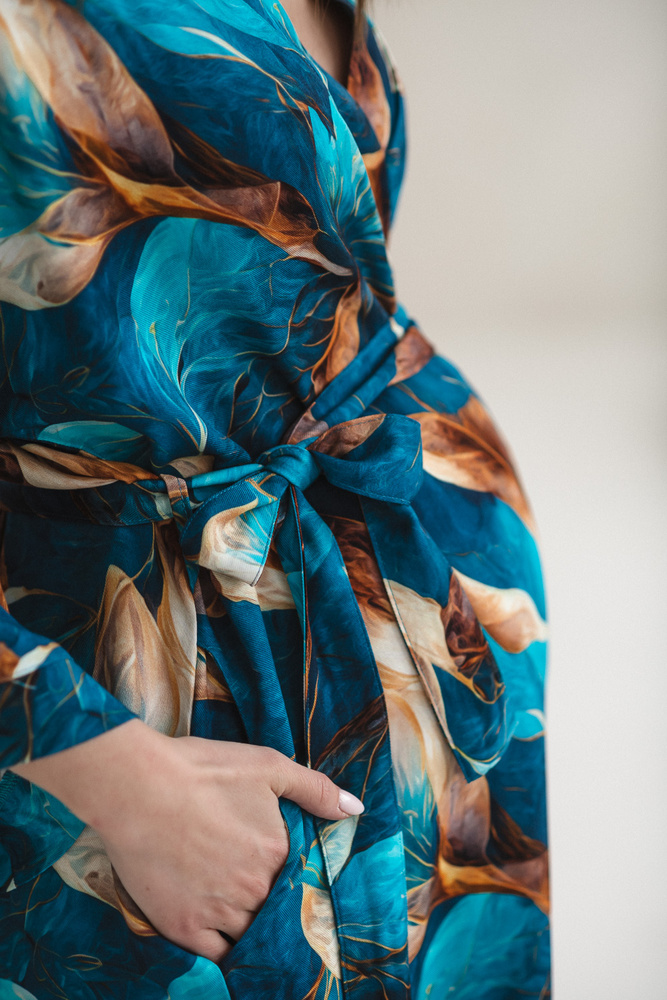 El corte tipo kimono con cinturón permite ajustar el ancho según las necesidades, adaptándose al vientre en crecimiento y manteniendo la comodidad también después del parto. Su longitud adecuada aporta discreción y seguridad en el hospital o en casa durante la lactancia. Las mangas 7/8 facilitan el cuidado del recién nacido sin estorbar, y los bolsillos prácticos resultan útiles para pequeños objetos.