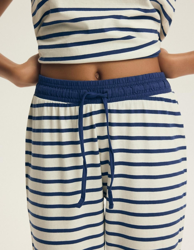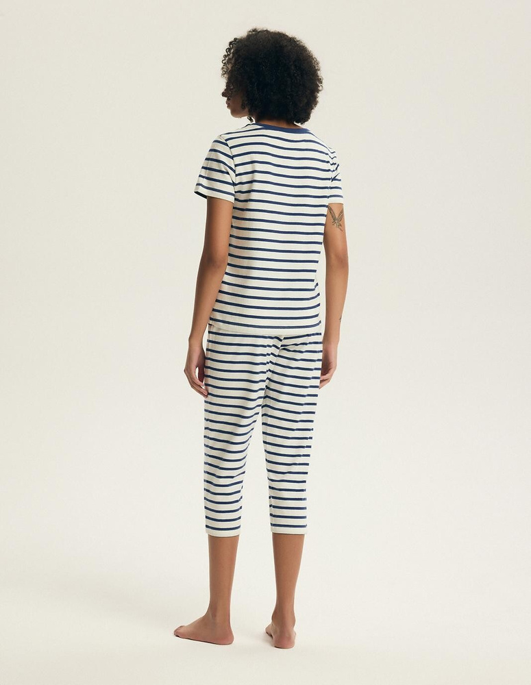 • Pijama de mujer en 100% algodón con diseño a rayas – camiseta de manga corta y pantalón 7/8 con cordón ajustable en la cintura. Comodidad natural para dormir y relajarse en casa.