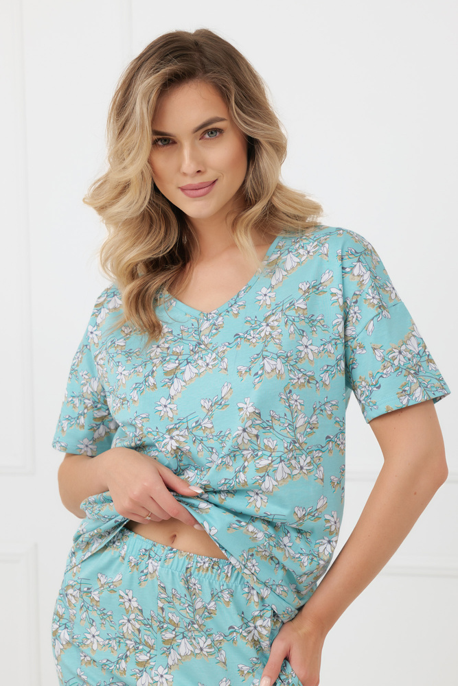 La parte superior presenta una línea clásica con escote en V, que estiliza visualmente la silueta y aporta ligereza al conjunto. Las mangas cortas lo hacen adecuado para temperaturas suaves o espacios interiores calefaccionados. El pantalón 3/4 incluye bolsillos prácticos, un detalle funcional que permite usar el pijama no solo para dormir, sino también como ropa cómoda de casa.