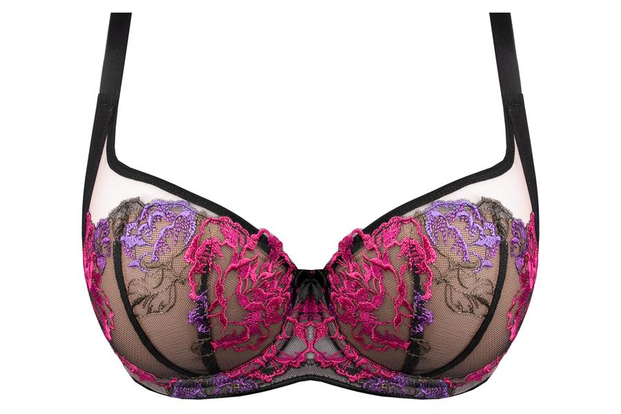 La estructura de copa completa (full cup) con copas con relleno cubre totalmente el pecho y distribuye el peso de manera uniforme. Esto permite modelar una forma redondeada y natural sin efecto push-up. La banda inferior firme aporta mayor sujeción y ayuda a reducir la presión en los hombros. El puente central, correctamente diseñado, mantiene el busto en su posición, mientras que los tirantes regulables permiten un ajuste personalizado.