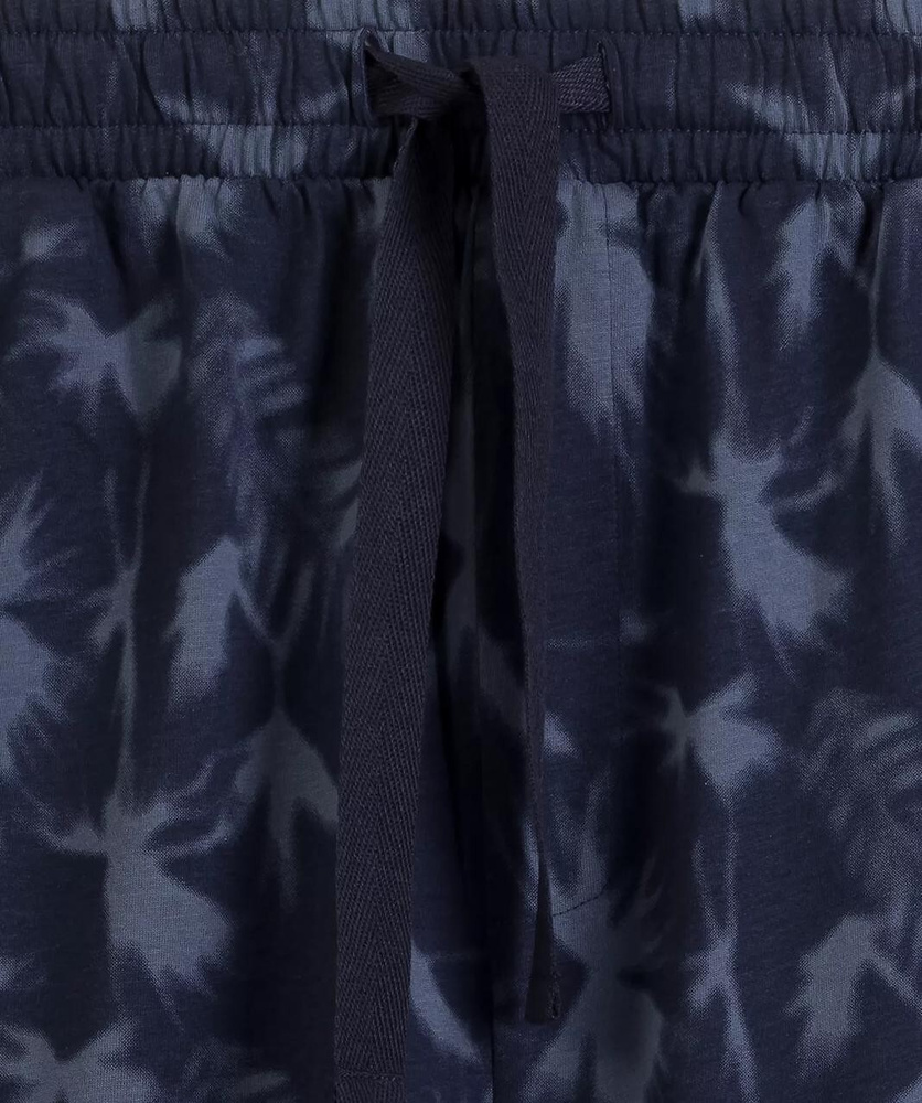 La parte inferior está formada por pantalones cortos holgados con estampado tropical de palmeras, que aportan un toque veraniego y relajado. La cintura cuenta con goma elástica recubierta de algodón y cordón ajustable, lo que permite adaptar fácilmente el ajuste. Los prácticos bolsillos laterales aumentan la funcionalidad para el uso diario.