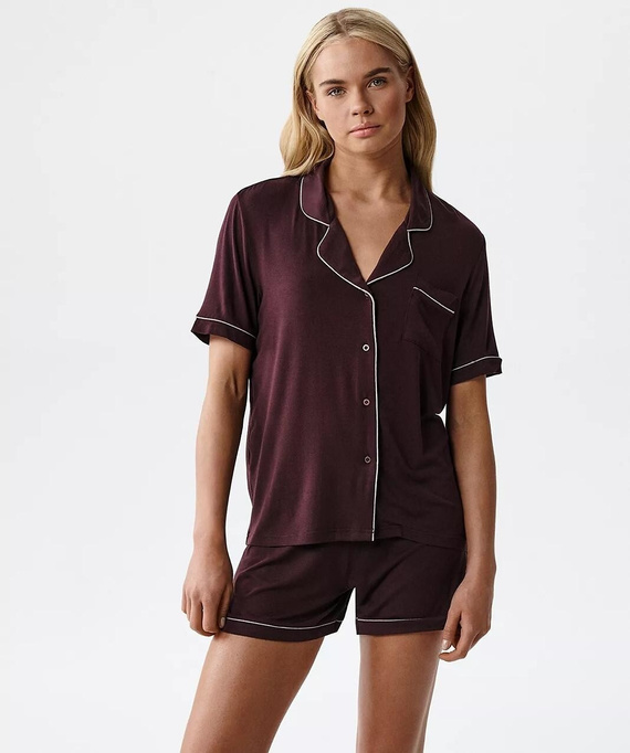 La parte superior es una camiseta de manga corta con cuello clásico y cierre con botones, lo que aporta un estilo elegante y relajado al mismo tiempo. En el pecho incorpora un pequeño bolsillo que añade un detalle práctico y discreto. El conjunto incluye shorts con cintura elástica y cordón ajustable, lo que permite adaptar fácilmente el ajuste a la silueta.