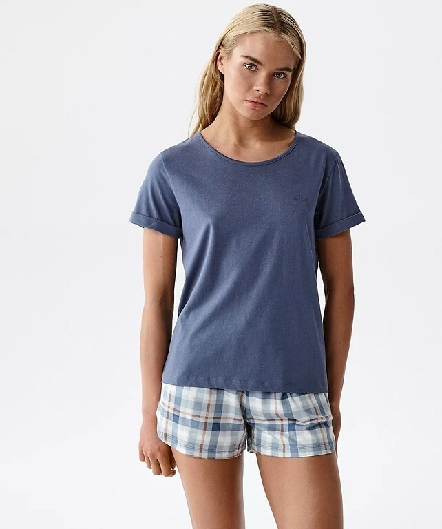 La parte superior es una camiseta de manga corta con escote redondo, diseñada para adaptarse de forma natural al cuerpo sin generar presión. En la parte frontal destaca un mensaje delicado que aporta un toque moderno y relajado al conjunto. El pijama se completa con shorts estampados con bolsillos cómodos a la altura de la cadera, que añaden funcionalidad y libertad de movimiento. La cintura elástica garantiza un ajuste cómodo.