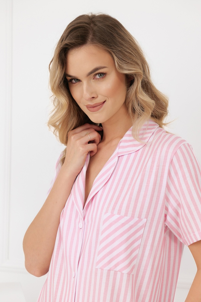 El patrón de rayas verticales estiliza visualmente la silueta y aporta un toque ligero y elegante. El cuello clásico tipo camisa refuerza su carácter atemporal, por lo que este modelo no solo es perfecto para dormir, sino también como ropa cómoda para casa.
