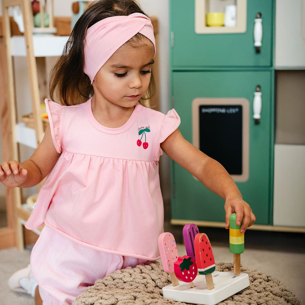 Si buscas una prenda cómoda y a la vez con estilo para los días más cálidos, la body túnica Eevi Cherry en color rosa suave con estampado de cerezas es una opción muy acertada. Este modelo combina la funcionalidad de un body con la ligereza de una túnica, por lo que resulta perfecto para el uso diario, paseos y juegos al aire libre.