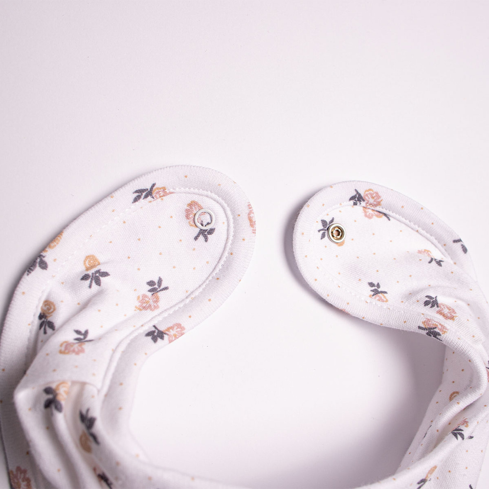Está confeccionada con 100% algodón certificado, seguro para la piel sensible del bebé. El tejido es suave, transpirable y absorbe bien la humedad, lo que resulta especialmente útil durante la etapa de dentición. Gracias a su diseño funcional y cierre práctico, la bandana se mantiene en su sitio sin apretar ni moverse.
