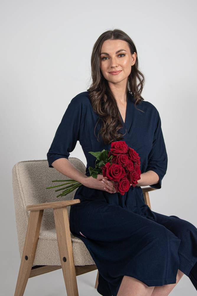 El modelo de corte más largo envuelve perfectamente el cuerpo, mientras que las mangas 3/4 y el lazo en la cintura acentúan el talle, aportando ligereza y feminidad al conjunto.