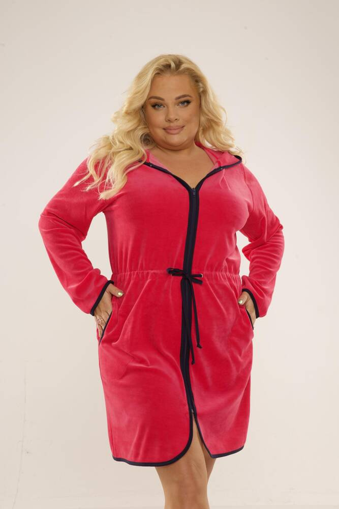 Bata corta de señora con capucha y cierre de cremallera. De terciopelo. Tirantes ajustables en la cintura. El albornoz se adapta perfectamente a la forma del cuerpo, es extremadamente suave y ligero. Envolverse en él después del baño es un placer!