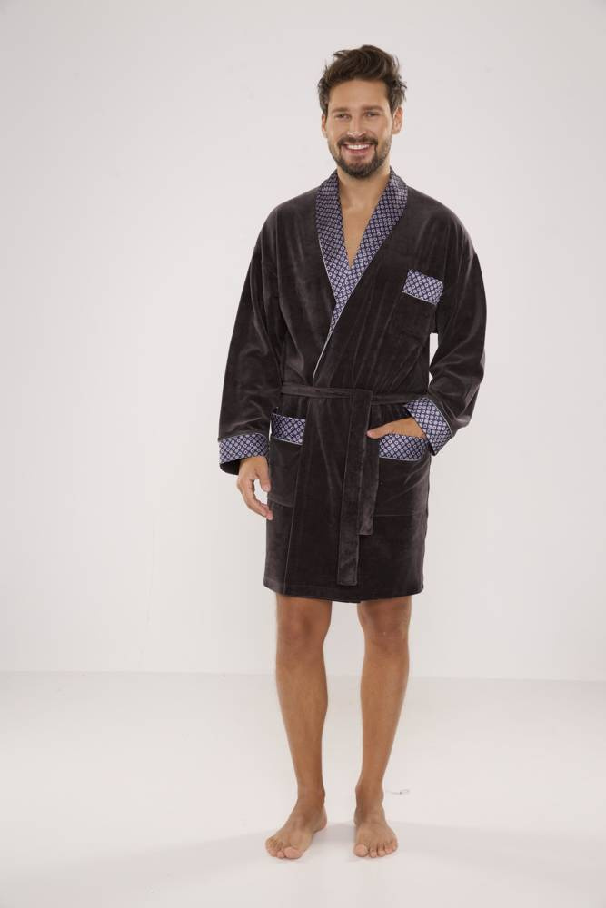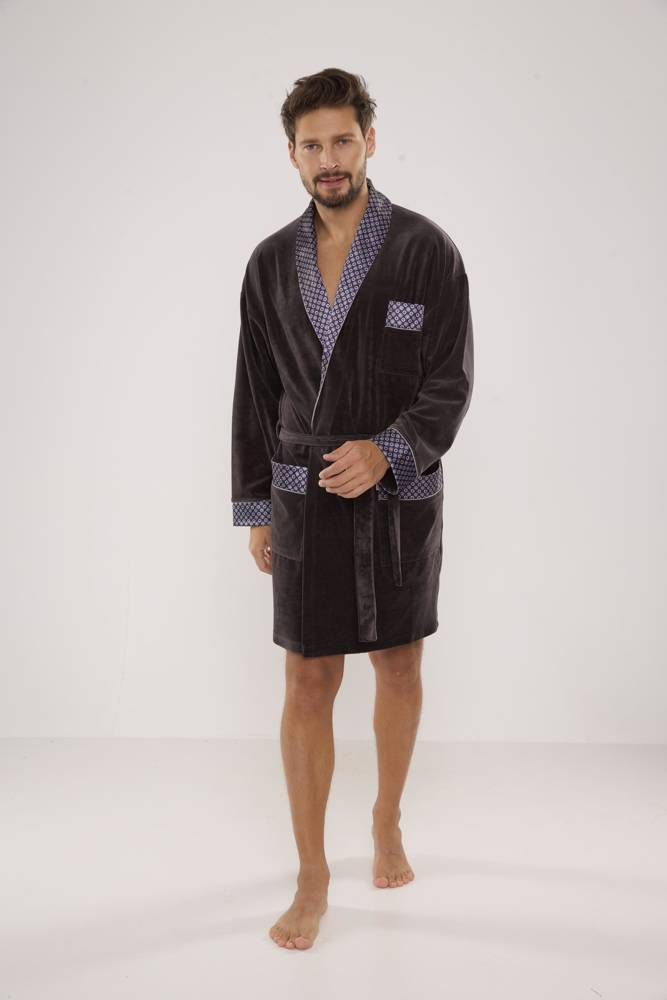 Bata corta de terciopelo para hombre, con cuello chal, atada a la cintura, con dos bolsillos de parche y un bolsillo más pequeño a la altura del pecho. Puños, cuello y bolsillos acabados en satén estampado. Está fabricado con un 80% de algodón agradable al tacto con una perfecta absorción del agua.