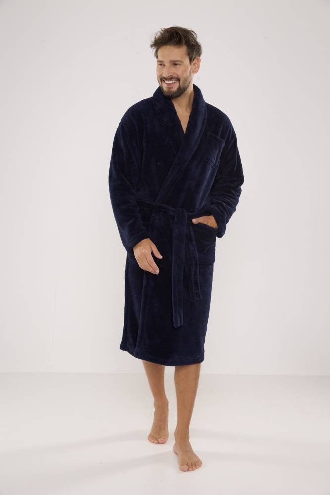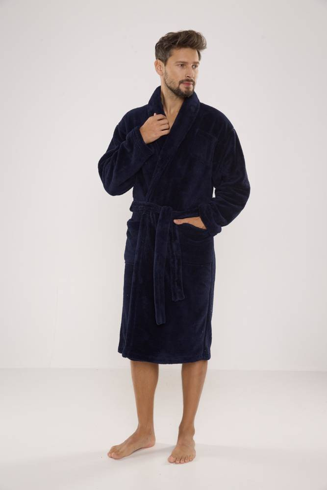 Albornoz de caballero elegante y muy cómodo. Tejido de felpa cálido, suave y agradable al tacto. El corte clásico sienta muy bien a la figura. El modelo cuenta con dos prácticos bolsillos y un lazo en la cintura.