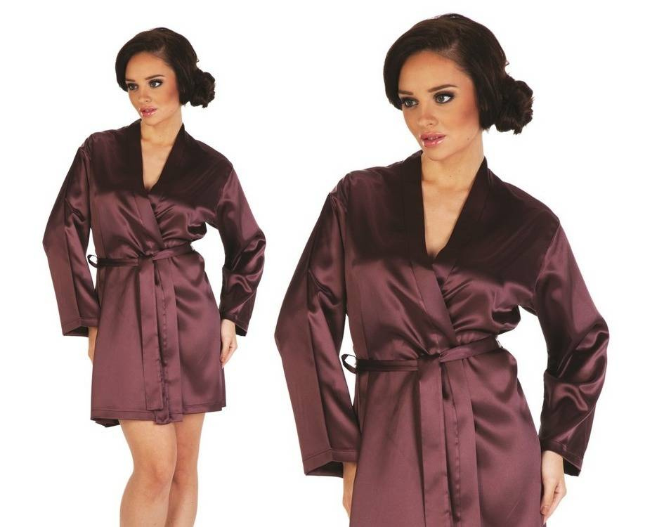 El sencillo albornoz corto de satén impresiona por su elegancia y su uso casi versátil.