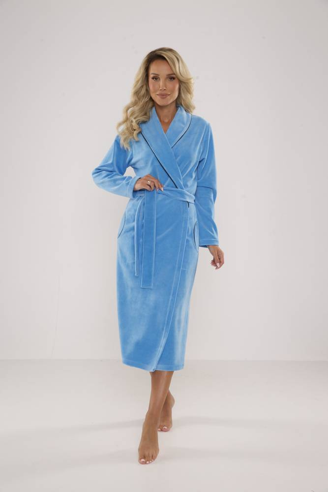 Albornoz largo y cómodo para mujer con cuello chal. De agradable terciopelo que se siente bien en el cuerpo. Atado a la cintura, con bolsillos. Ribeteado en color de contraste.