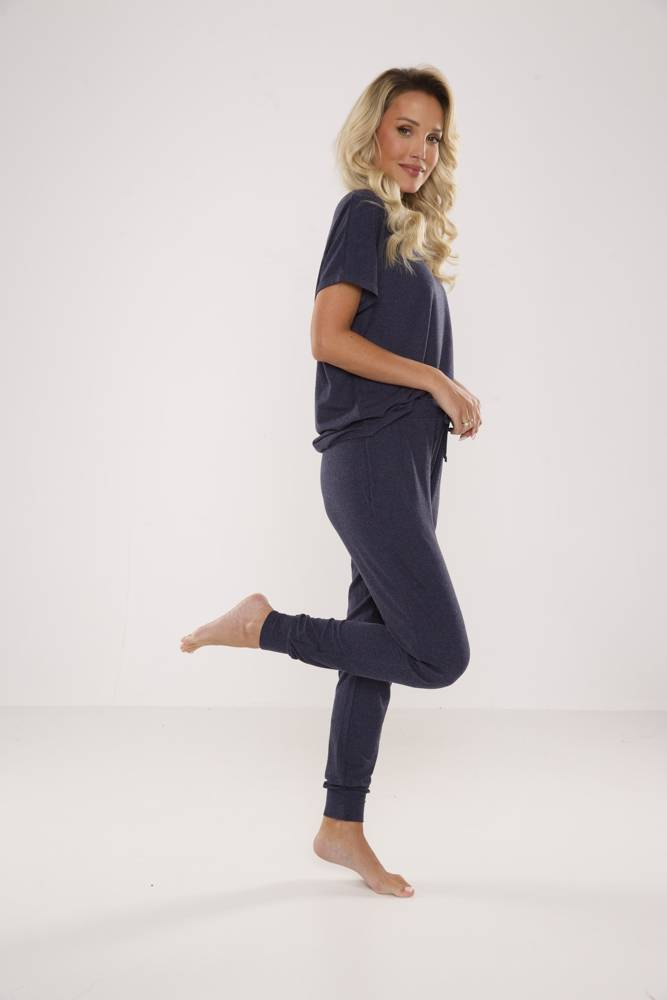 Pijama de señora en viscosa de alta calidad con elastano. Camiseta holgada con mangas cortas de reglan. Pantalón largo con bolsillos y remates en las perneras.