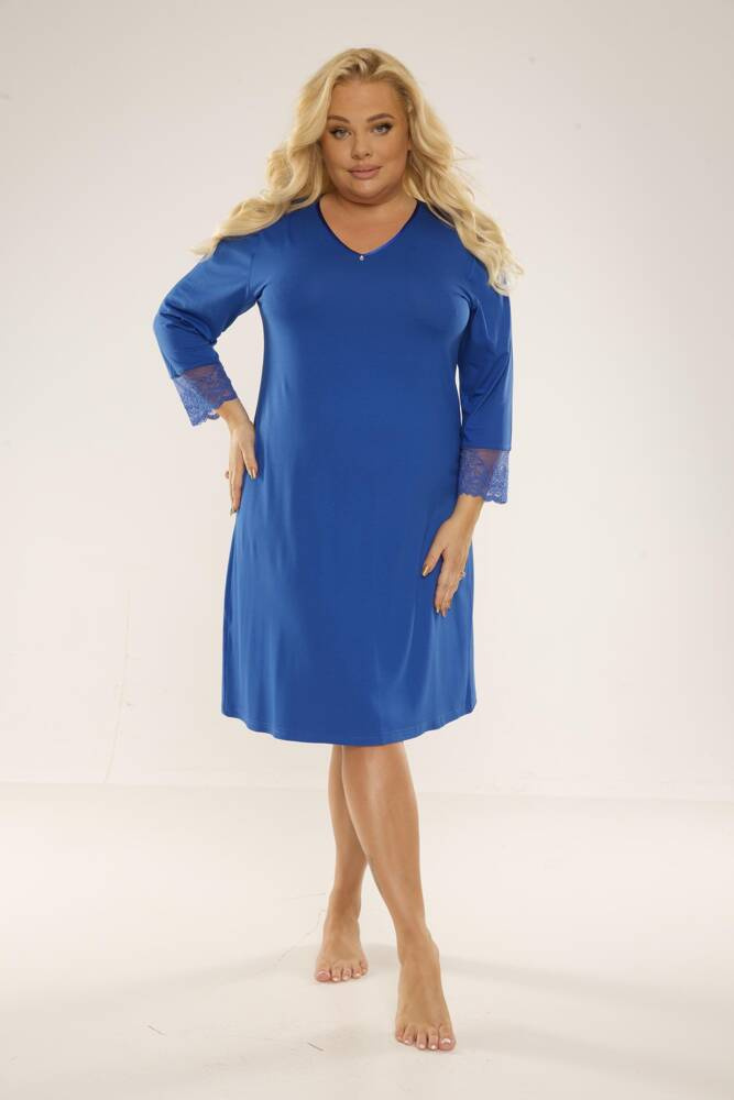 Camisa de señora, de viscosa de alta calidad, con mangas de 7/8 de largo. Escote y espalda en V, puños acabados en encaje ancho con motivo floral. Hasta la rodilla.