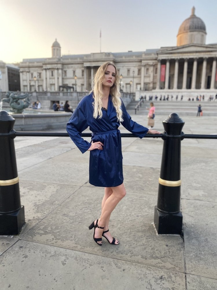 El sencillo albornoz corto de satén impresiona por su elegancia y su uso casi versátil.