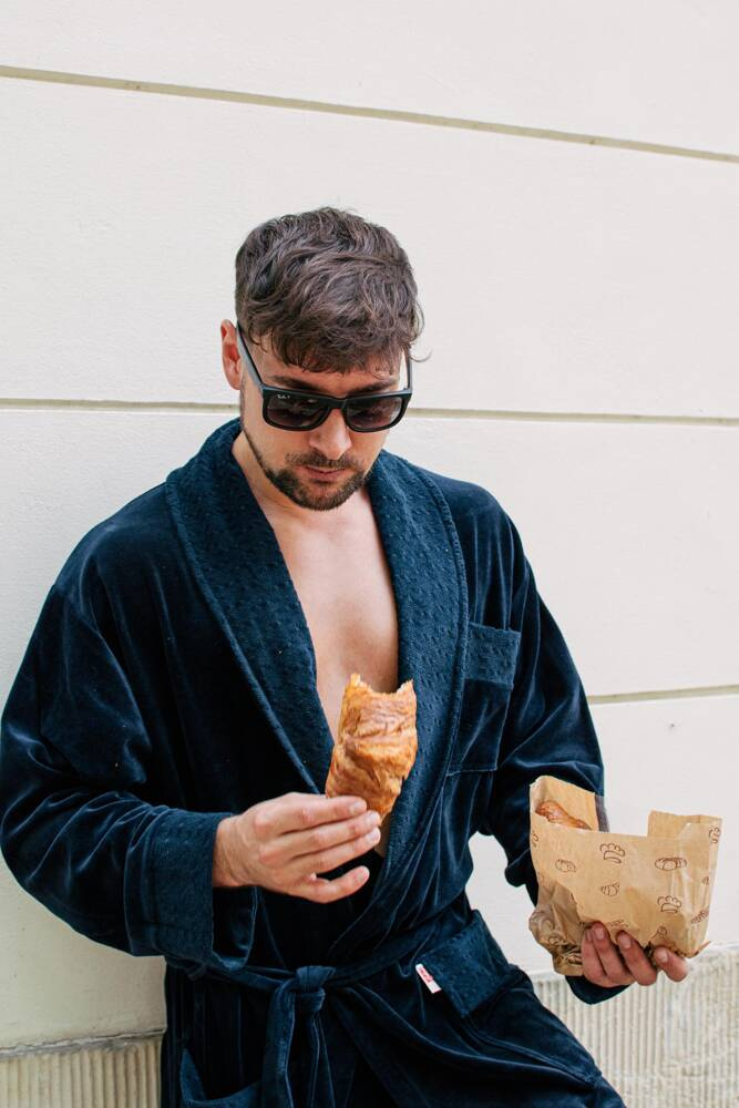 Bata larga de caballero de terciopelo, con cuello chal, cinturón de anudar, con dos bolsillos de parche y un bolsillo más pequeño a la altura del pecho. Puños, cuello y bolsillos acabados en relieve. Modelo fabricado en algodón 80%, agradable al tacto, absorbe perfectamente el agua.
