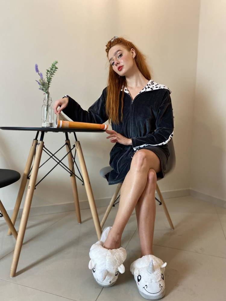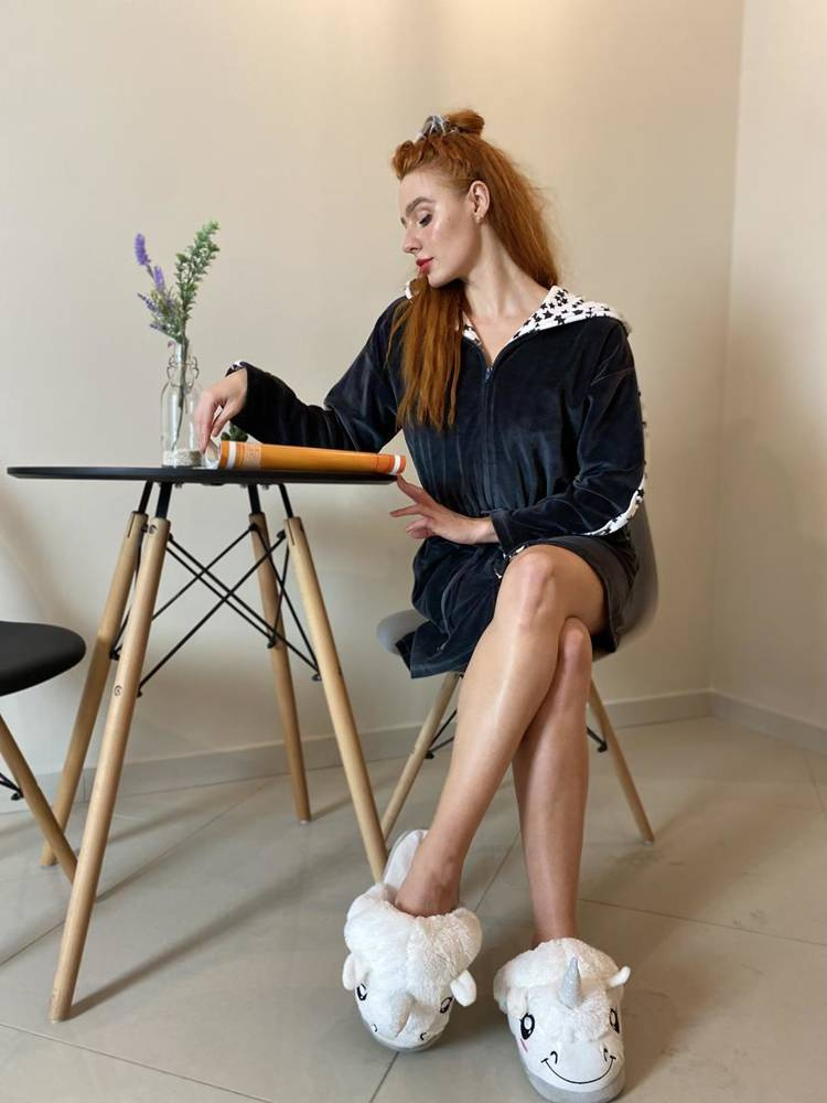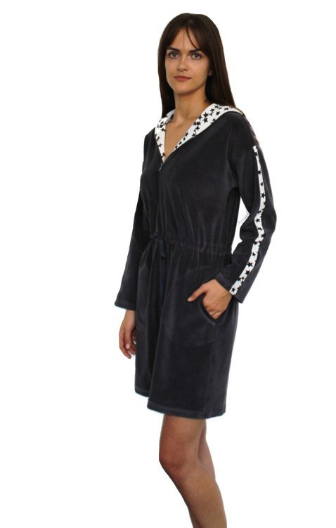 Bata corta de señora con capucha y cierre de cremallera. De terciopelo. Ribete de capucha y mangas decorado con estrellas. Tirantes ajustables en la cintura. El albornoz se adapta perfectamente a la forma del cuerpo, es extremadamente suave y ligero. Envolverse en él después del baño es un placer!